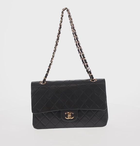 CHANEL Matelasse 25 Double Flap Chain Bag Lamb Skin Black Gold CC Auth BA9001SAM